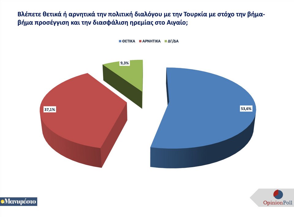 Μια καθαρή πλειοψηφία της τάξης του 53.6% βλέπει θετικά την πολιτική του διαλόγου με την Τουρκία με στόχο την βήμα βήμα προσέγγιση και την διασφάλιση ηρεμίας στο Αιγαίο. Τα μεγαλύτερα ποσοστά τα βρίσκουμε ανάμεσα στους ψηφοφόρους της Ν.Δ με 77.2% και του ΠΑΣΟΚ με 58.3%. Στον ΣΥΡΙΖΑ το ποσοστό αυτό πέφτει στο 40.8% και στο Κ.Κ.Ε στο 42.1% . Τα χαμηλότερα ποσοστά τα βρίσκουμε ανάμεσα στους ψηφοφόρους της ΕΛΛΗΝΙΚΗΣ ΛΥΣΗΣ ( 31.6%) , ΤΗΣ ΠΛΕΥΣΗΣ ( 28.1%) κ.λ.π. Τα μεγαλύτερα ποσοστά θετικών απόψεων συναντούνται στην Κεντροδεξιά με 71.1%, το Κέντρο με 56.1% και την Δεξιά με 54.6%.