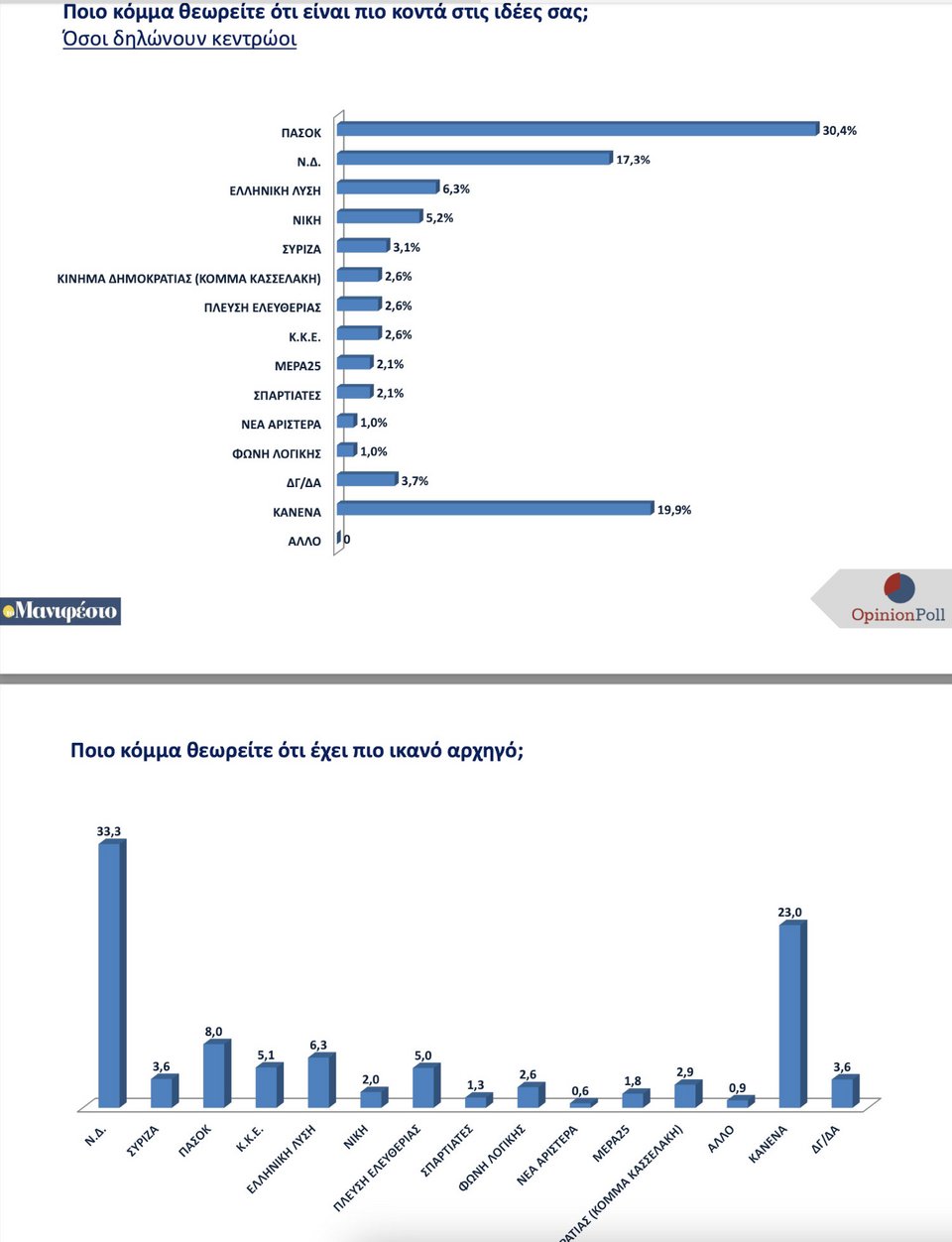- Το 23.7% θεωρεί ότι είναι πιο κοντά στις ιδέες της Ν.Δ, με δεύτερο το κανένα με 16.9% και τρίτο το ΠΑΣΟΚ με 14.3%. Όλα τα άλλα κόμματα βρίσκονται αρκετά πιο χαμηλά και πιο συγκεκριμένα Κ.Κ.Ε 6%, ΕΛΛΗΝΙΚΗ ΛΥΣΗ 5.6%, ΣΥΡΙΖΑ 5.5%, ΦΩΝΗ ΛΟΓΙΚΗΣ 4.6%, ΠΛΕΥΣΗ ΕΛΕΥΘΕΡΙΑΣ 4% , ΚΙΝΗΜΑ ΔΗΜΟΚΡΑΤΙΑΣ 4%, ΝΙΚΗ 2.7%ΜΕΡΑ 25 2.2, ΣΠΑΡΤΙΑΤΕΣ 1.9%, ΝΕΑ ΑΡΙΣΤΕΡΑ 1.6%.