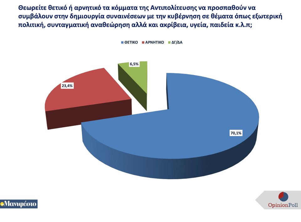 Επίσης , φαίνεται πως οι πολίτες θέλουν να δουν συνολικά από το πολιτικό σύστημα , ότι αναζητεί συναινέσεις τόσο σε μείζονα θέματα όπως εξωτερική πολιτική ή συνταγματική αναθεώρηση , αλλά και θέματα που αφορούν στην καθημερινότητά του( ακρίβεια, υγεία, παιδεία) . Το 70.1% θεωρεί θετική τη αναζήτηση συναινέσεων , ενώ το 23.4% αρνητική. Τα μεγαλύτερα ποσοστά θετικής άποψης υπέρ των συναινέσεων βρίσκονται ανάμεσα στους ψηφοφόρους της Ν.Δ με 83% και του ΠΑΣΟΚ με 76.9%, ενώ υψηλά είναι τα θετικά ποσοστά ανάμεσα στους Κεντροδεξιούς με 83.1%, τους Κεντρώους με 73.7%, τους Κεντραριστερούς με 73.5% και τους Δεξιούς με 72.2%.