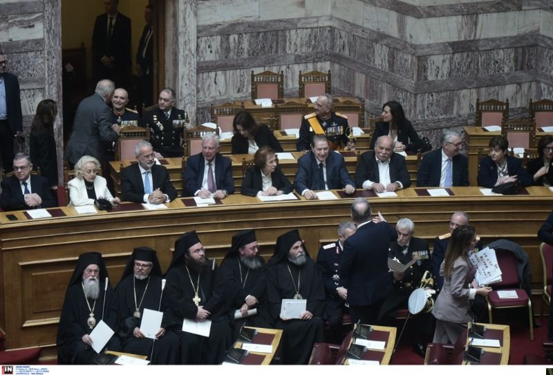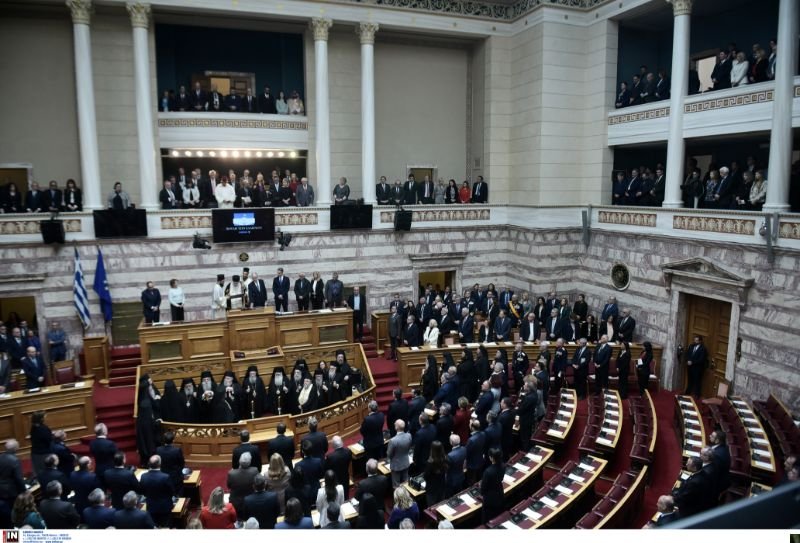 Ακολούθησε δοξολογία, με τον Κώστα Τασούλα να στέκεται δίπλα στον πρωθυπουργό Κυριάκο Μητσοτάκη και τον πρόεδρο της Βουλής Νικήτα Κακλαμάνη, δίπλα στα έδρανα του προεδρείου του Σώματος.