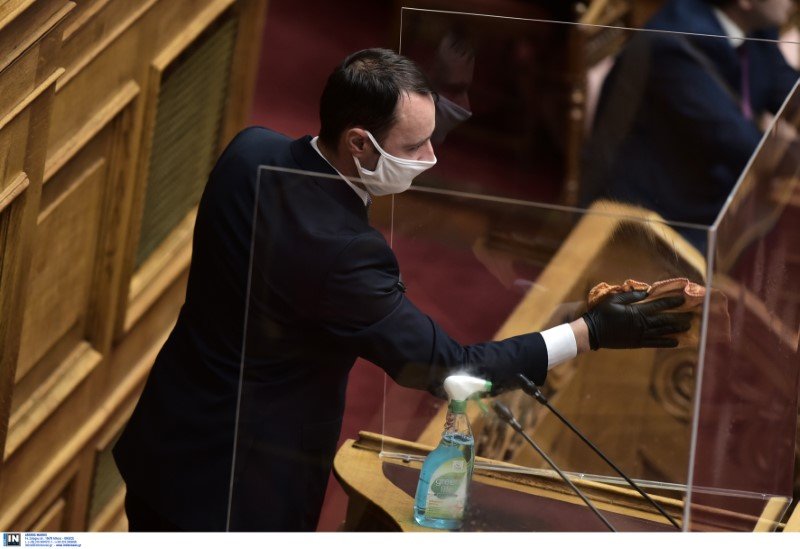 Ο Κυριάκος Μητσοτάκης ετοιμάζεται να πάρει τον λόγο, ενώ υπάλληλος της Βουλής με μάσκα καθαρίζει το βήμα