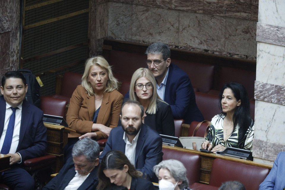 Από αριστερά ο Γιάννης Μπουρνούς, η Ρένα Δούρου, η Δώρα Αυγέρη και πίσω τους ο Χρήστος Γιαννούλης. Στα μπροστινά έδρανα ο Ευκλείδης Τσακαλώτος, η Εφη Αχτσιόγλου, η Αθηνά Λινού, η μόνη που από την πτέρυγα που φόρεσε τη μάσκα της...