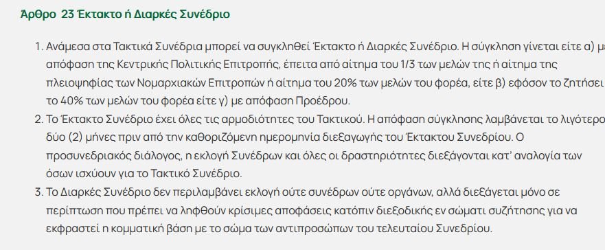 Το Άρθρο 23 του καταστατικού του ΠΑΣΟΚ προβλέπει ότι ανάμεσα στα Τακτικά Συνέδρια μπορεί να συγκληθεί Έκτακτο ή Διαρκές Συνέδριο, είτε με απόφαση της Κεντρικής Πολιτικής Επιτροπής, έπειτα από αίτημα του 1/3 των μελών της ή αίτημα της πλειοψηφίας των Νομαρχιακών Επιτροπών ή αίτημα του 20% των μελών του φορέα, είτε εφόσον το ζητήσει το 40% των μελών του φορέα, είτε με απόφαση Προέδρου.