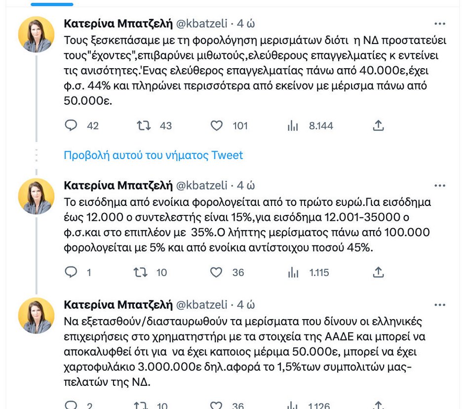 Στο θέμα μπήκε «σφήνα» σήμερα και η Κατερίνα Μπατζελή, η οποία επιχείρησε να δικαιολογήσει την αύξηση στο 15% της φορολογίας των μερισμάτων των επιχειρήσεων από 100.000 ευρώ και πάνω, λέγοντας, μεταξύ άλλων, ότι «τους ξεσκεπάσαμε με τη φορολόγηση μερισμάτων, διότι η ΝΔ προστατεύει τους "έχοντες", επιβαρύνει μισθωτούς, ελεύθερους επαγγελματίες και εντείνει τις ανισότητες».