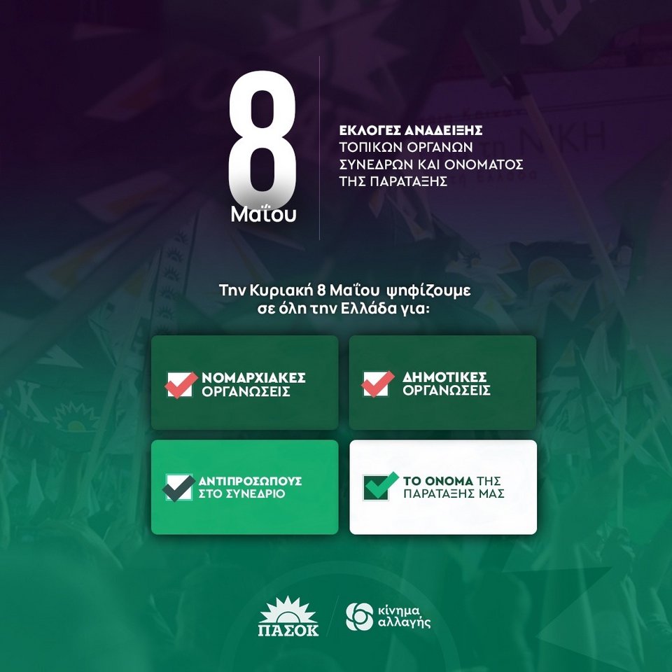 «Την Κυριακή 8 Μαΐου, εκλέγουμε Νομαρχιακές & Δημοτικές Οργανώσεις, συνέδρους, ενώ αποφασίζουμε και για το όνομα της παράταξης μας!» αναφέρει το ΠΑΣΟΚ-ΚΙΝΑΛ σε ανακοίνωσή του.