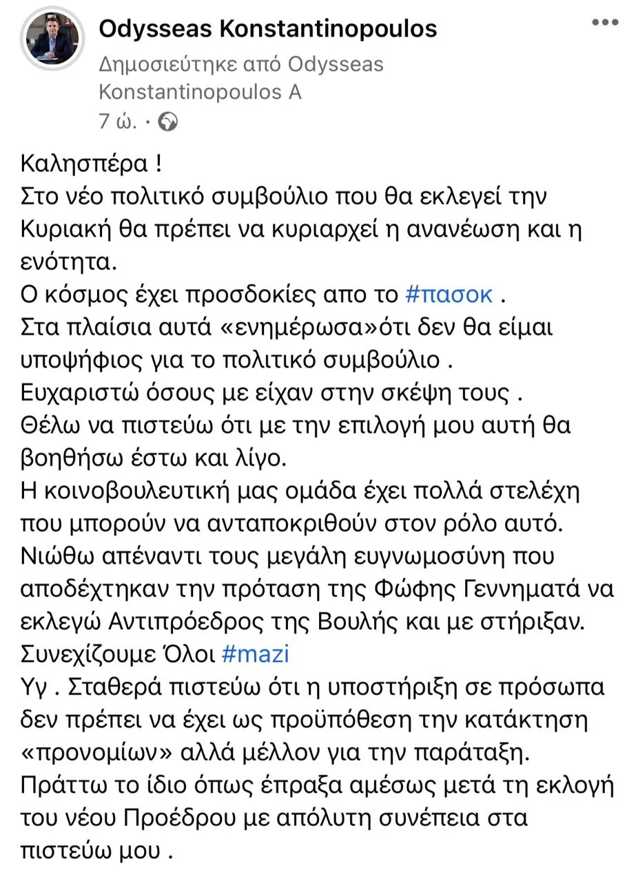 Έτσι μετά το «κενό» που αφήνει ο Οδ. Κωνσταντινόπουλος είναι πιθανόν να προταθεί από τον πρόεδρο του ΠΑΣΟΚ να εκλεγεί μία γυναίκα βουλευτής, είτε η Χαρά Κεφαλίδου, είτε η Νάντια Γιαννακοπούλου (και οι δύο είχαν στηρίξει Α. Λοβέρδο στην εσωκομματική μάχη για την προεδρία).