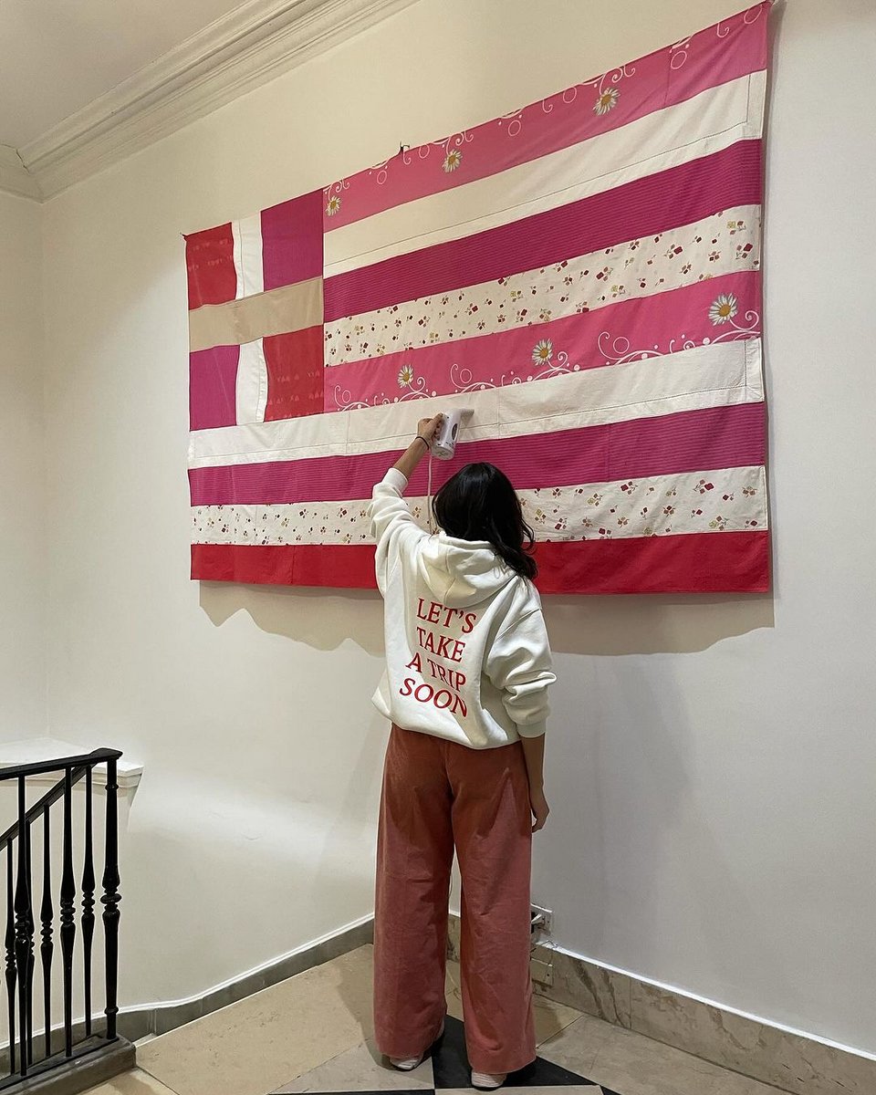 Σημειώνεται πως το έργο είναι μία ελληνική σημαία φτιαγμένη από ροζ σεντόνια, που δημιουργήθηκε ως διαμαρτυρία για την ενδοοικογενειακή βία που βιώνουν χιλιάδες γυναίκες και τις αλλεπάλληλες γυναικοκτονίες.