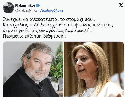 «Καραχάλιος = Δώδεκα χρόνια σύμβουλος πολιτικής στρατηγικής της οικογένειας Καραμανλή. Περιμένω επίσημη διάψευση» έγραψε, με νόημα, ο κ. Πλακιάς.