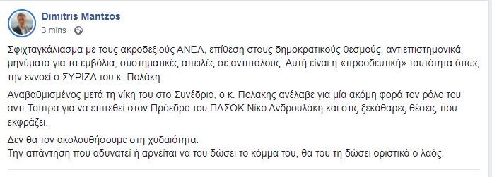 Σε ανάρτησή του, ο εκπρόσωπος Τύπου του ΠΑΣΟΚ-ΚΙΝΑΛ Δημήτρης Μάντζος, αργά το βράδυ της Μ. Δευτέρας επεσήμανε ότι ο κ. Πολάκης ανέλαβε ξανά τον ρόλο του αντι-Τσίπρα.