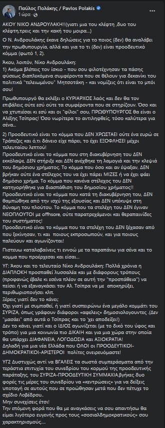Η ανάρτηση του Παύλου Πολάκη κατά του Νίκου Ανδρουλάκη