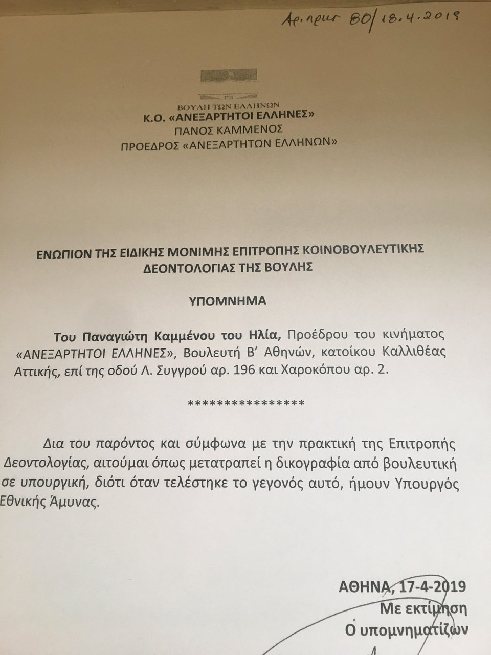 Ανάλογη ήταν η απάντηση του Πάνου Καμμένου στη μήνυση που κατέθεσε εναντίον του ο εκδότης των «Παραπολιτικών» Γιάννης Κουρτάκης. Και αυτός επικαλέστηκε τον νόμο περί ευθύνης υπουργών. Δείτε μάλιστα το υπόμνημα που έστειλε ο πρόεδρος των ΑΝΕΛ: