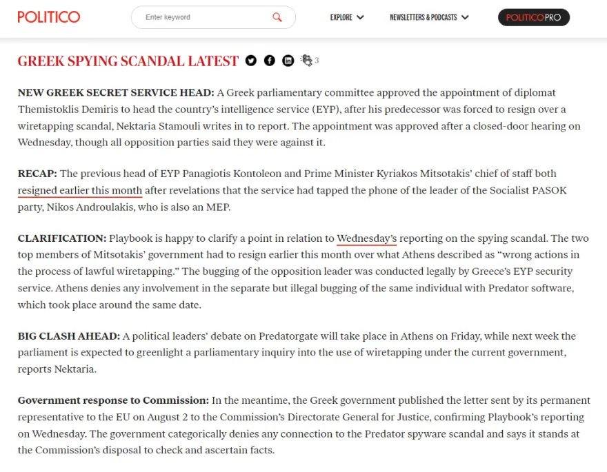 Το Politico διευκρινίζει επίσης ότι η Αθήνα έχει αποσαφηνίσει πως δεν έχει καμία σχέση με το κατασκοπευτικό σύστημα Predator, αν και στη χθεσινή έκδοση της «Brussels Playbook» είχε προκαλέσει σύγχυση, κάνοντας λόγο για «σκάνδαλο όπου εμπλέκεται το κακόβουλο λογισμικό Predator, το οποίο περιβάλλει την κυβέρνηση του Πρωθυπουργού Κυριάκου Μητσοτάκη» (scandal involving Predator malware that engulfed the government of Greek Prime Minister Kyriakos Mitsotakis).
