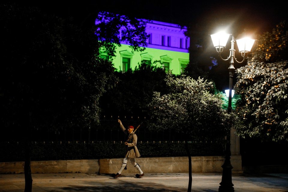 Με τα χρώματα της Ουκρανικής σημαίας φωταγωγήθηκε απόψε το Προεδρικό μέγαρο.