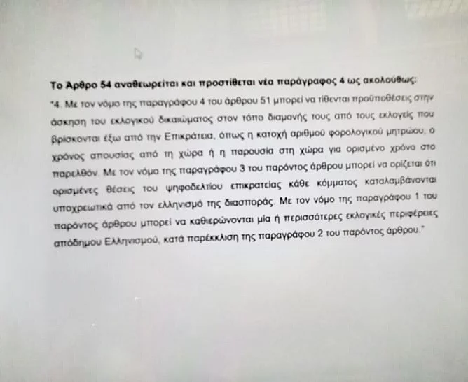 4. Με τον νόμο της παραγράφου 4 του άρθρου 51 μπορεί να τίθενται προυποθέσεις στην άσκηση του εκλογικού δικαιώματος στον τόπο διαμονής τους από τους εκλογείς που βρίσκονται έξω από την Επικράτεια, όπως η κατοχή αριθμού φορολογικού μητρώου, ο χρόνος απουσίας από την χώρα ή η παρουσία στην χώρα για ορισμένο χρόνο στο παρελθόν. Με τον νόμο της παραγράφου 3 του παρόντος άρθρου μπορεί να ορίζεται ότι ορισμένες θέσεις του ψηφοδελτίου επικρατείας κάθε κόμματος καταλαμβάνονται υποχρεωτικά από τον ελληνισμό της διασποράς. Με τον νόμο της παραγράφου 1 του παρόντος άρθρου μπορεί να καθιερώνονται μία ή περισσότερες εκλογικές περιφέρειες απόδημου Ελληνισμού, κατά παρέκκλιση της παράγραφου 2 του παρόντους άρθρου.