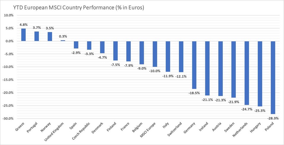 Συγκεκριμένα, η Ελλάδα έχει θετικές αποδόσεις κατά 4,8% και είναι στην πρώτη θέση του σχετικού δείκτη, με την Πορτογαλία να ακολουθεί με 3,7%, τη Νορβηγία με 3,5% και το Ηνωμένο Βασιλείου να είναι οριακά θετικό με 0,3%. Όλες οι υπόλοιπες χώρες που περιλαμβάνονται στον σχετικό δείκτη καταγράφουν αρνητικές επιδόσεις. Ακόμα και χώρες με θεωρητικά πολύ πιο ισχυρή οικονομία από την ελληνική, βρίσκονται πολύ χαμηλά στον σχετικό δείκτη. Για παράδειγμα, η Γαλλία καταγράφει αρνητική επίδοση κατά 7,9%, η Ιταλία κατά 11,9% ενώ η Γερμανία κατά 18,5%.