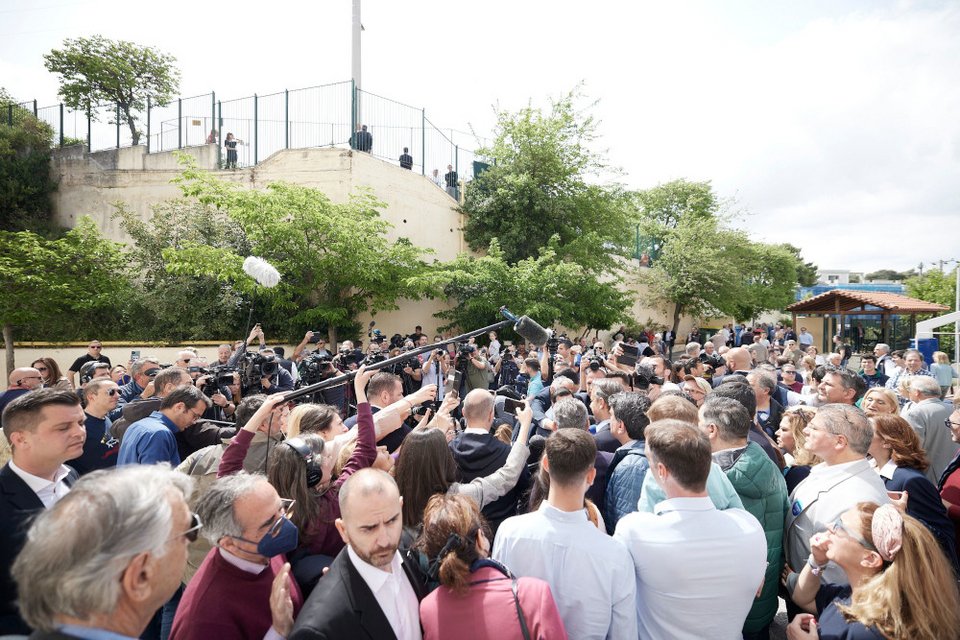 Ο κ. Μητσοτάκης έβγαλε selfies με πολίτες, χαιρέτησε τον κόσμο που βρισκόταν εκεί και για να ψηφίσει επέδειξε την ψηφιακή ταυτότητά του.