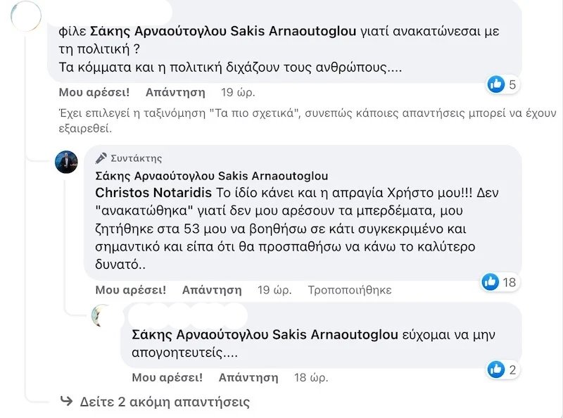 Και η άμεση εξήγηση του κ. Αρναούτογλου: «Το ίδιο κάνει και η απραγία, Χρήστο μου! Δεν “ανακατώθηκα” γιατί δεν μου αρέσουν τα μπερδέματα, μου ζητήθηκε στα 53 μου να βοηθήσω σε κάτι συγκεκριμένο και σημαντικό και είπα ότι θα προσπαθήσω να κάνω το καλύτερο δυνατό».
