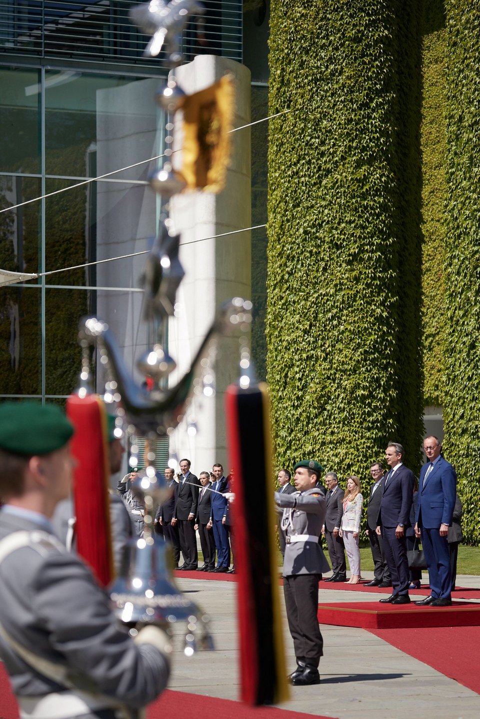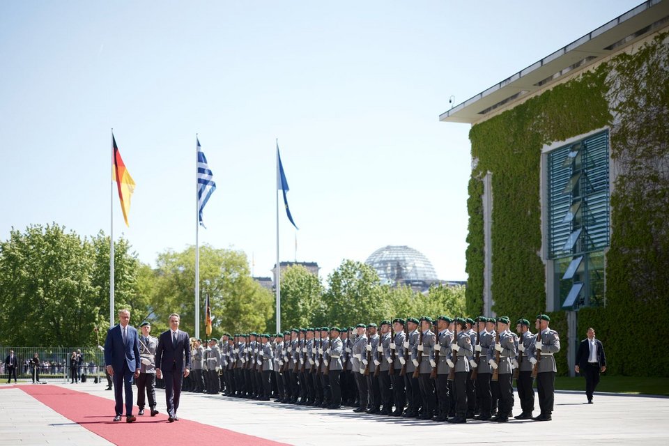 Ο κ. Μητσοτάκης έγινε δεκτός με στρατιωτικές τιμές, ενώ είναι ο πρώτος ηγέτης που υποδέχεται ο νέος καγκελάριος από την ανάληψη των καθηκόντων του.