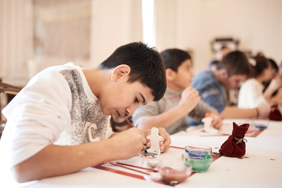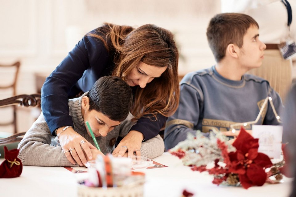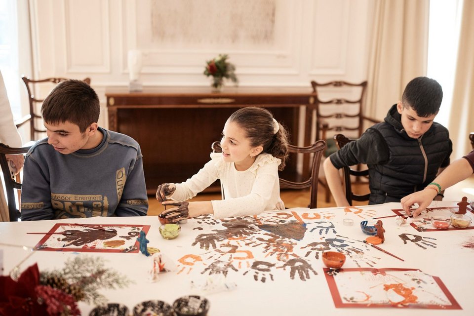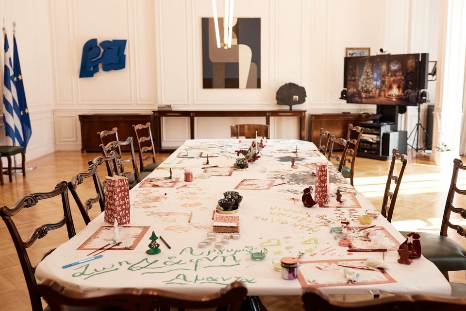Στη συνέχεια, τα αγόρια και κορίτσια ζωγράφισαν και έκαναν χειροτεχνίες, με τη βοήθεια των συνοδών τους και παιδαγωγών από το κέντρο έκφρασης «Τα Χρώματα της Ίριδας», δίνοντας στον Πρωθυπουργό και στην κόρη του εορταστικές κάρτες.