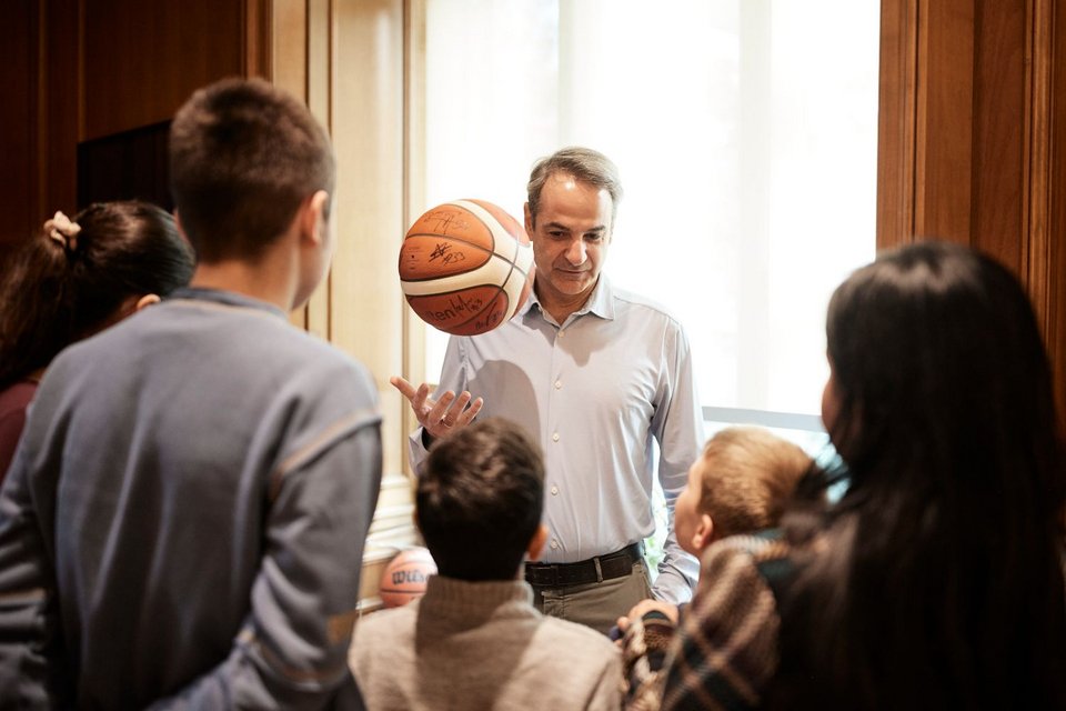 Ο Κυριάκος Μητσοτάκης έπαιξε με τα παιδιά, μίλησε μαζί τους για τα μαθήματά τους και τις αγαπημένες τους ασχολίες, τους έδωσε παιχνίδια και, αφού τα ξενάγησε στο γραφείο του, τους χάρισε την μπάλα με τις υπογραφές των διεθνών της εθνικής ομάδας μπάσκετ.