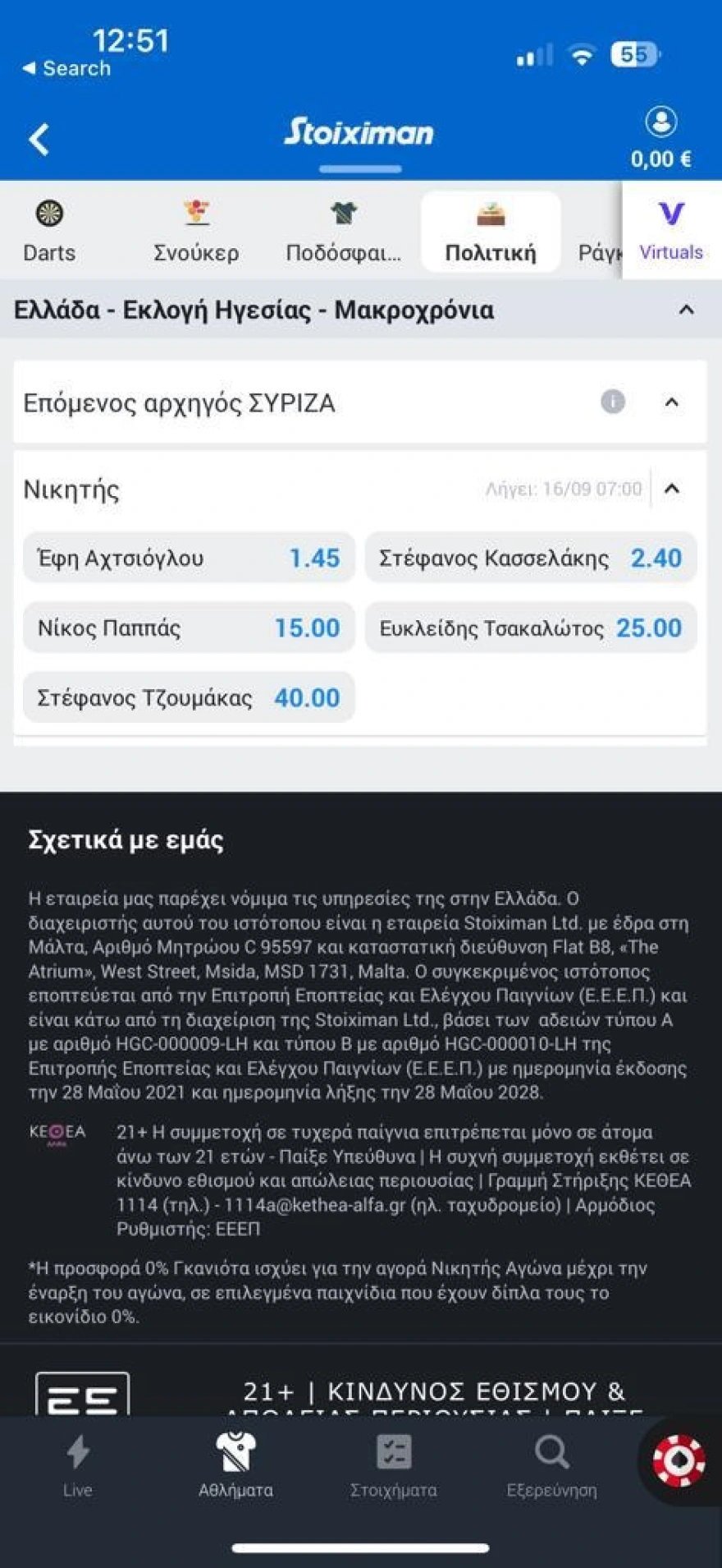 Οι εσωκομματικές εκλογές στο ΣΥΡΙΖΑ για την ανάδειξη νέου προέδρου απασχολούν και τις στοιχηματικές εταιρείες με τις αποδόσεις να ανατρέπονται μετά την ανακοίνωση της υποψηφιότητας του Στέφανου Κασσελάκη.