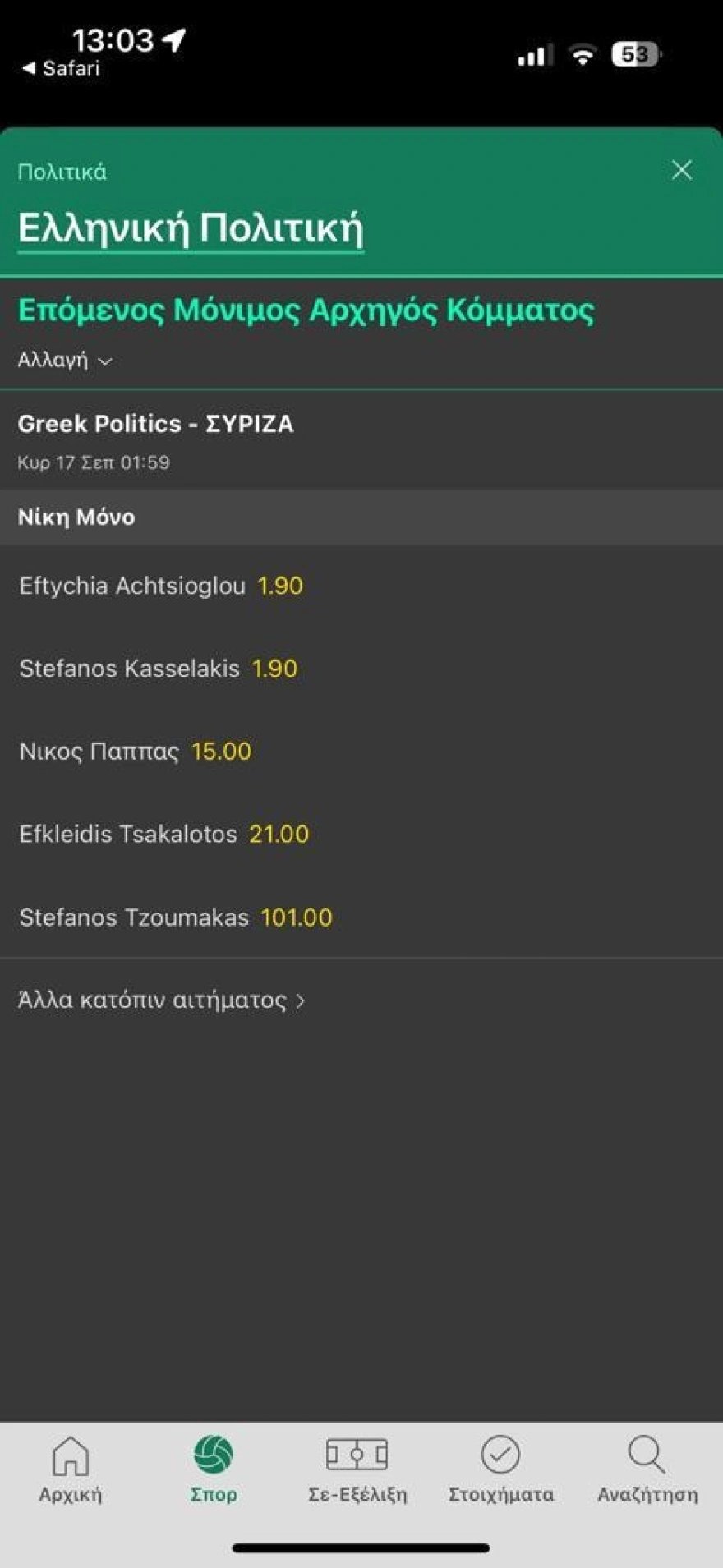 Στις αποδόσεις άλλης στοιχηματικής οι αποδόσεις καταγράφουν ισοπαλία ανάμεσα σε Εφη Αχτσιόγλου και Στέφανο Κασσελάκη με 1.90, ενώ ακολουθούν ο Νίκος Παππάς με 15.00, ο Ευκλείδης Τσακαλώτος με 21.00 και τέλος ο Στέφανος Τζουμάκας με 101.00.
