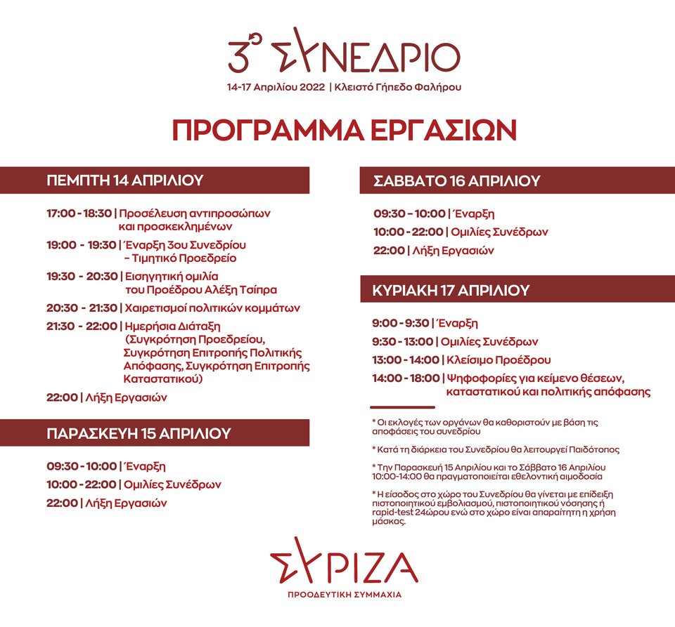 Το 3ο Συνέδριο του ΣΥΡΙΖΑ θα διεξαχθεί από τις 14 έως 17 Απριλίου 2022 στο Κλειστό Γήπεδο Φαλήρου (Τάε κβον Ντο).