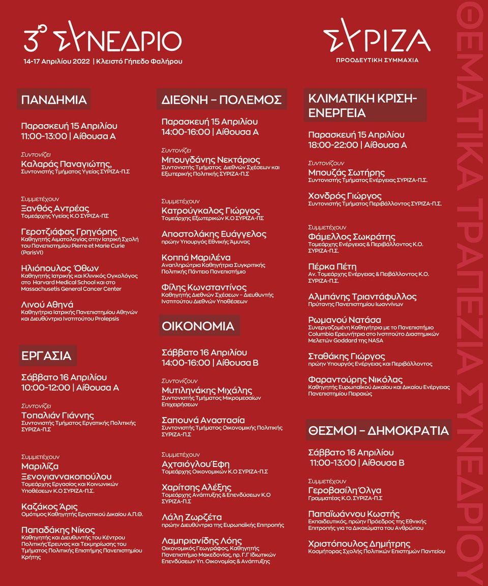 Οι εργασίες του συνεδρίου αρχίζουν την Πέμπτη 14 Απριλίου και ώρα 6:30 μ.μ. με ομιλία του προέδρου του ΣΥΡΙΖΑ–Προοδευτική Συμμαχία, Αλέξη Τσίπρα. Στα πλαίσια του Συνεδρίου θα πραγματοποιηθούν και θεματικά τραπέζια.