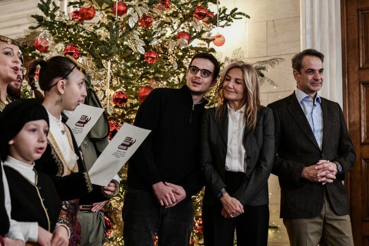 Τα κάλαντα, συνοδεία της κόρης του Δάφνης, του γιου του Κωνσταντίνου και της συζύγού του Μαρέβας άκουσε ο πρωθυπουργός, Κυριάκος Μητσοτάκης, στο Μέγαρο Μαξίμου.