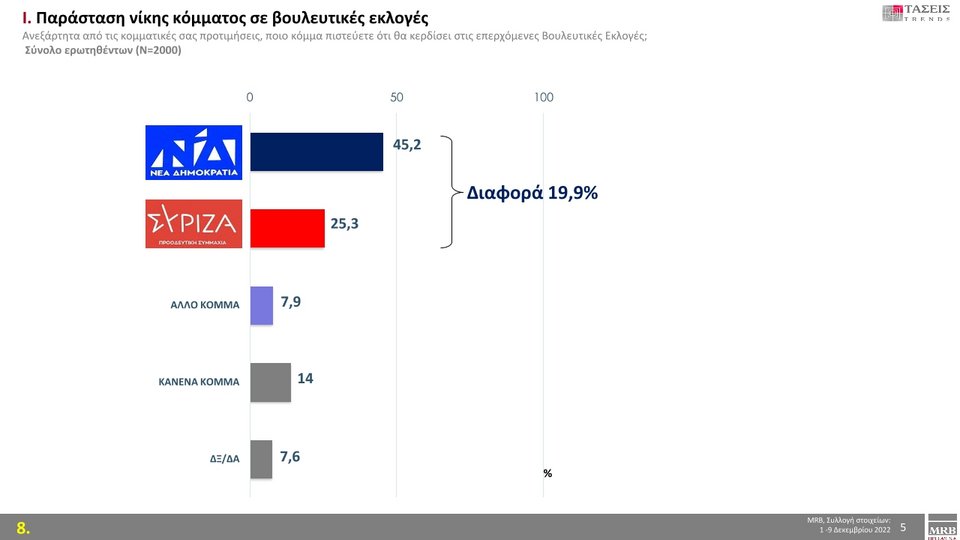 Σύμφωνα με τις Τάσεις της MRB για τον μήνα Δεκέμβριο, η ΝΔ προηγείται του ΣΥΡΙΖΑ κατά 5,4 ποσοστιαίες μονάδες.