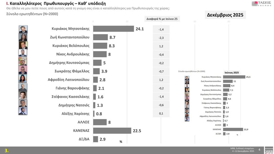 Σε ό,τι αφορά την προτίμηση των πολιτών σε σχέση με τον καταλληλότερο πρωθυπουργό, ο Κυριάκος Μητσοτάκης παραμένει πρώτος.