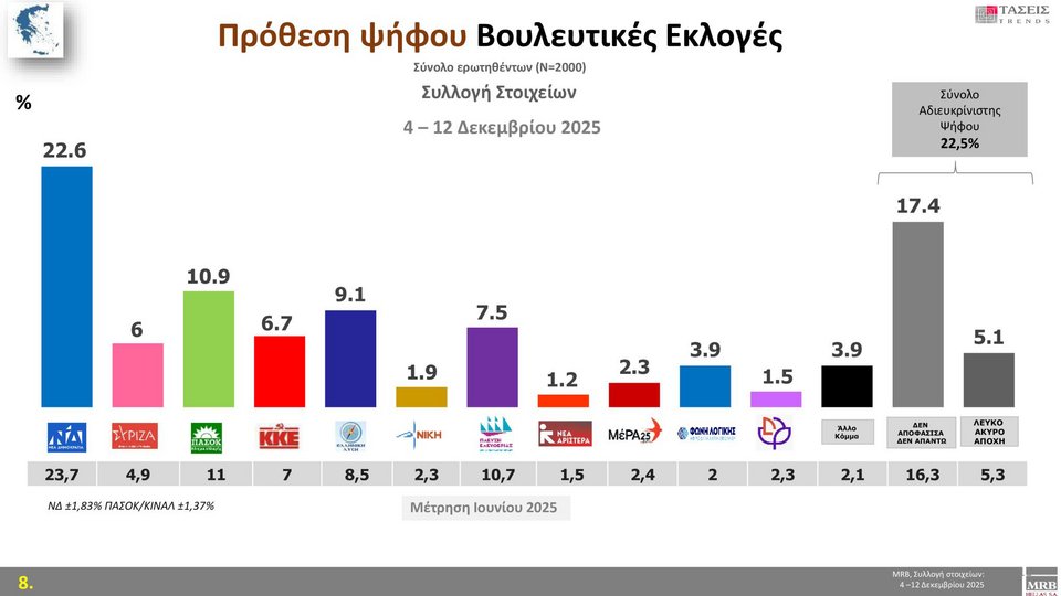 Σταθερά πρώτη παραμένει η ΝΔ στις τάσεις της MRB, με 11,7 μονάδες διαφορά από το ΠΑΣΟΚ.