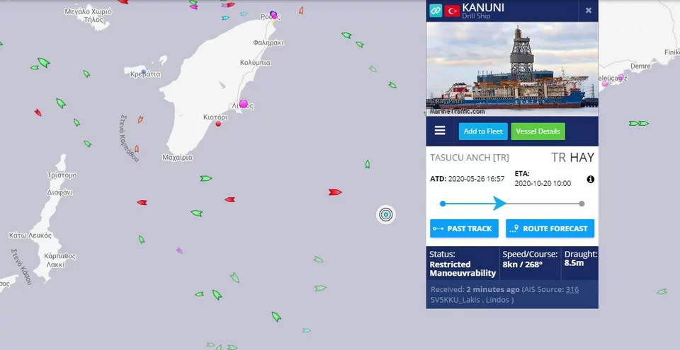 Την ίδια ώρα ωστόσο, ένα από τα τουρκικά γεωτρύπανα, το Kanuni, είχε ξεκινήσει πορεία από το λιμάνι Tasucu στη Μερσίνη. Αρχικός προορισμός ήταν το λιμάνι Haydarpasa της Κωνσταντινούπολης., ωστόσο στην διάρκεια της νύχτας το πλοίο συνέχιζε να πλέει νοτιοδυτικά του Καστελόριζου και τις πρώτες πρωινές ώρες, συνεχίζει την πορεία του νοτιοδυτικά και σχετικά κοντά στο Oruc Reis.