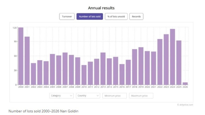 Τα τελευταία χρόνια καταγράφεται έντονη κινητικότητα στην παγκόσμια αγορά τέχνης για τα φωτογραφικά έργα της Goldin, με αποκορύφωμα το 2024. Ηταν μια δυνατή χρονιά για την Αμερικανίδα εικαστικό, αφού άλλαξαν χέρια πάνω από 100 έργα της, σύμφωνα με τα στοιχεία της Artprice.