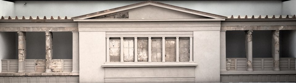 «Είναι οι πρώτες διώροφες ελληνικές στοές που γνωρίζουμε» σημειώνει η Αγγελική Κοτταρίδη στο κείμενό της «Το “βασίλειον” καθίδρυμα των Αιγών: Μορφές και λειτουργίες ενός εμβληματικού δημοσίου κτιρίου». «Ανάμεσά τους, προβάλλοντας ελαφρά το μνημειώδες πρόπυλο με δύο ραδινούς ιωνικούς αμφιπεσσοκίονες εν παραστάσι και μια πρωτοποριακή σειρά λίθινων ψευδοπαραθύρων στον όροφο, επιστέφεται από το χαρακτηριστικό αέτωμα και υποβάλλει την αίσθηση του ιερού (εικ. 2). Ακολουθεί ένα τεράστιων, για τα δεδομένα της εποχής, διαστάσεων (περ. 4.000 τ.μ.) περιστύλιο, που με 16×16 δωρικούς κίονες εικονοποιεί τη γεωμετρική και αριθμητική έννοια του τετραγώνου, απολύτως οργανικά και συγχρόνως αυστηρά γεωμετρικά ενταγμένο σε ένα σύστημα χώρων που το περιβάλλουν κανονικά από όλες τις πλευρές. Πίσω του βρίσκεται ένα δεύτερο μικρότερο περιστύλιο με εμβαδόν ίσο ακριβώς με τον αύλειο χώρο του πρώτου».