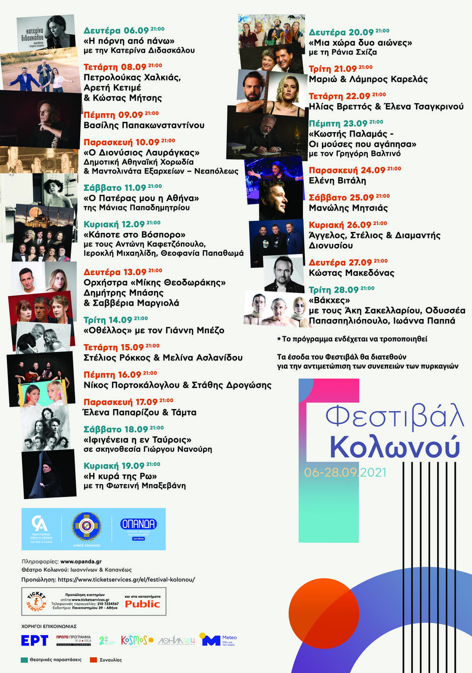 Ανοιξε αρχές Σεπτεμβρίου η αυλαία του Φεστιβάλ Κολωνού, με τον ΟΠΑΝΔΑ να διαθέτει όλα τα έσοδα στους πληγέντες από τις πυρκαγιές.