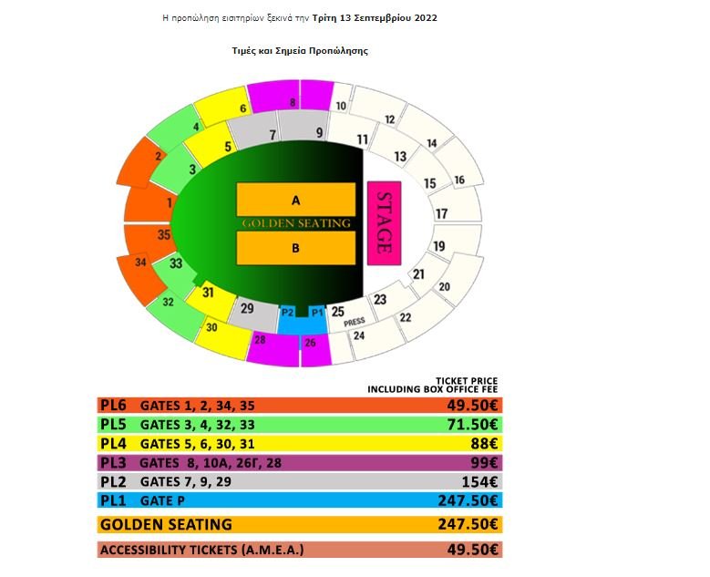 Golden Seating (Θέσεις καθημένων στον αγωνιστικό χώρο): 247,50 ευρώ