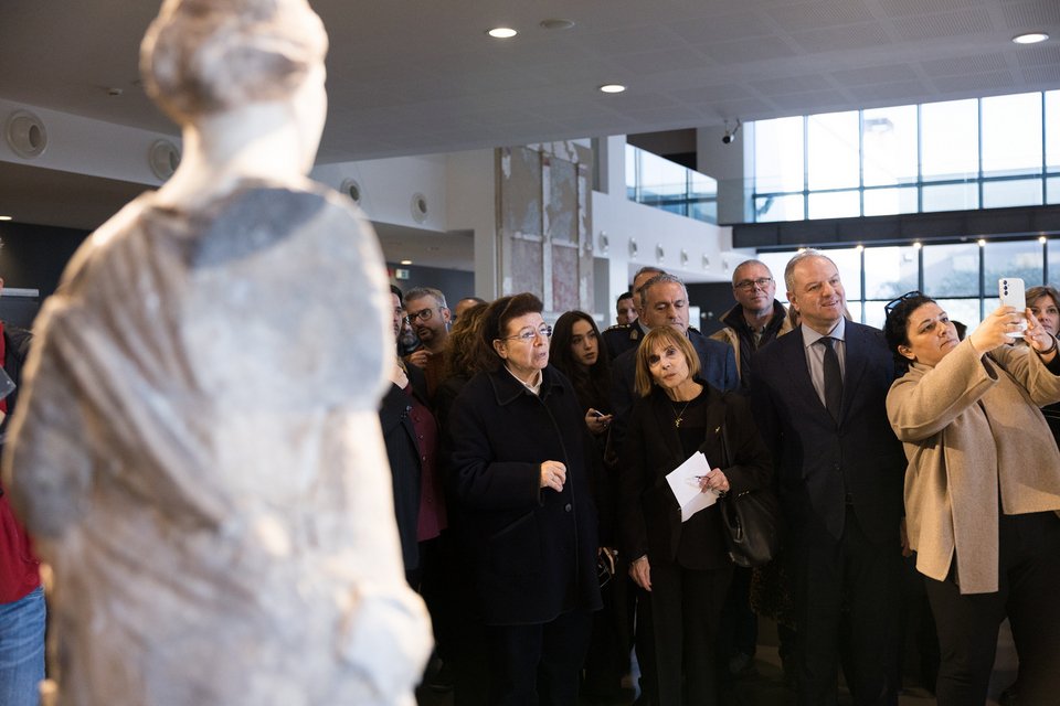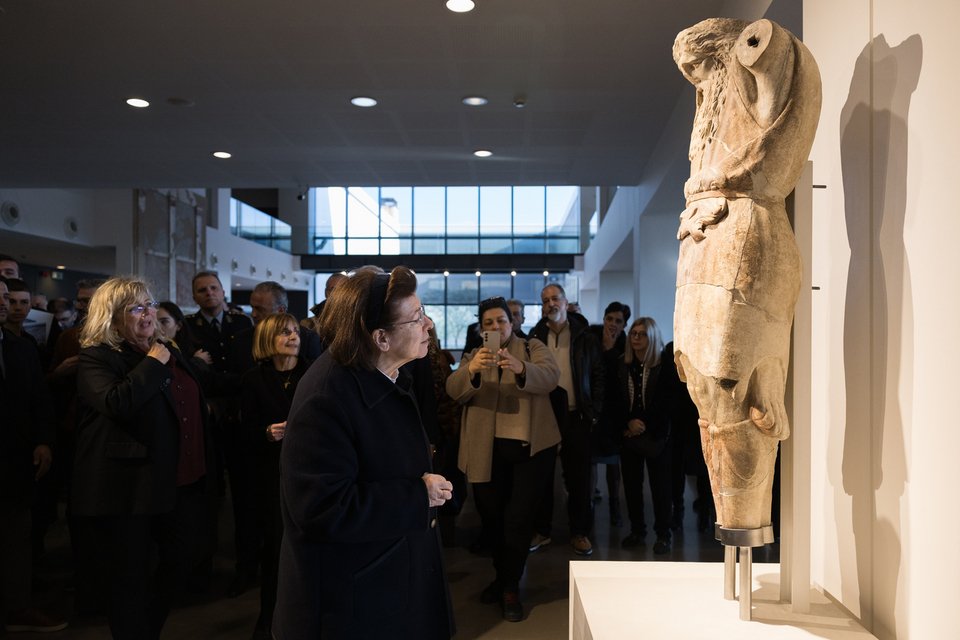Τα γλυπτά, αποκατεστημένα μετά από πολυετή εργασία συντήρησης, παρουσιάστηκαν για πρώτη φορά στο κοινό, παρουσία της υπουργού Πολιτισμού Λίνας Μενδώνη.