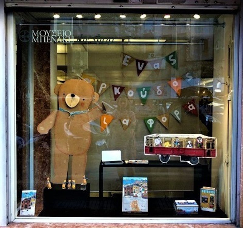 Είναι απλά ανθρωπίνως αδύνατο να περπατάς στην οδό Κριεζώτου, λίγο πριν το ύψος της Βουκουρεστίου και να μην ανακόψεις το βήμα σου, όσο και αν βιάζεσαι, για να δεις τον μεγάλο αρκούδο με την μπλε κορδέλα και τις υπέροχες εικονογραφήσεις που έχουν καταλάβει την βιτρίνα του Πωλητηρίου του Μουσείου Μπενάκη στην οδό Κριεζώτου, κάτω από την Πινακοθήκη Γκίκα.