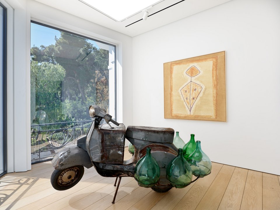 Σε δύο από τα πιο δυνατά έργα της έκθεσης, τα ZoCooter και Bunkely (2019), ο Hazoumè μετατρέπει παλιά σκούτερ λαθραίας μεταφοράς πετρελαίου σε σχεδόν μυθολογικά οχήματα. Πάνω τους συγκολλά μεταλλικά στοιχεία, φορτώνει νταμιτζάνες και ξαναγράφει την τοπική ιστορία της οικονομίας του Μπενίν – όχι από απόσταση, αλλά μέσα από τα ίδια τα εργαλεία του μόχθου. Το γυαλί και το μέταλλο συνυπάρχουν ως ετερόκλητοι συμβολισμοί: ανθεκτικότητα και ευθραυστότητα, ανάγκη και κίνδυνος.