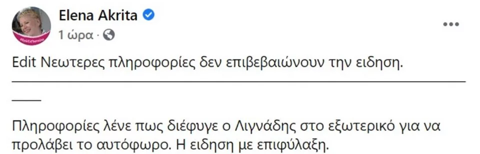 Σαφής και με λίγα λόγια, ο δικηγόρος Νίκος Γεωργουλέας που εκπροσωπεί τον Δημήτρη Λιγνάδη, νωρίς το πρωί απάντησε στη φήμη που κυκλοφορεί από το βράδυ της Πέμπτης περί φυγής του καλλιτέχνη στο εξωτερικό. Φήμη που έσπευσε να αναπαράγει σήμερα το πρωί η Ελενα Ακρίτα στον λογαριασμό της στο facebook, για να διορθώσει αργότερα με την ένδειξη Edit, και ενώ ήδη η αναρτησή της έκανε το γύρο του διαδικτύου και αναπαρήχθη σε εκπομπές.