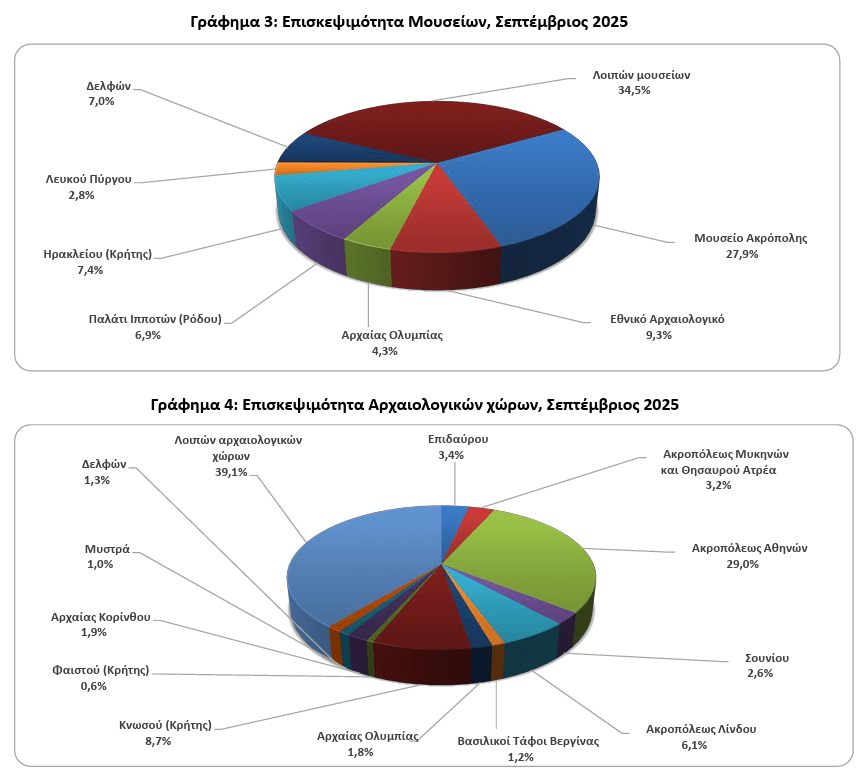 Σύμφωνα επίσης με την ΕΛΣΤΑΤ, στους αρχαιολογικούς χώρους τον Σεπτέμβριο 2025 σε σύγκριση με τον αντίστοιχο μήνα του 2024, καταγράφεται μείωση των επισκεπτών κατά 6,3%, αύξηση των επισκεπτών ελεύθερης εισόδου κατά 14,4% και αύξηση των εισπράξεων κατά 45,8%.