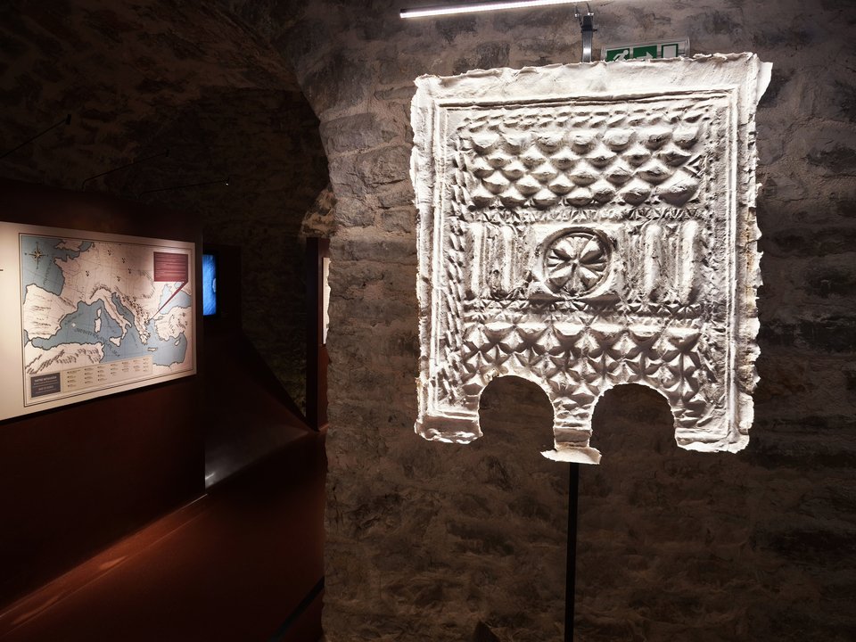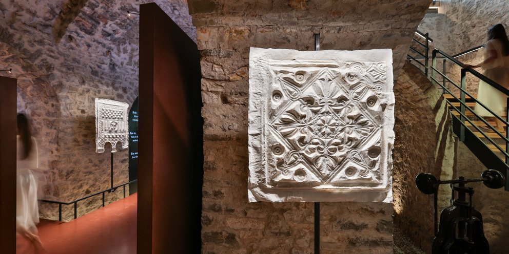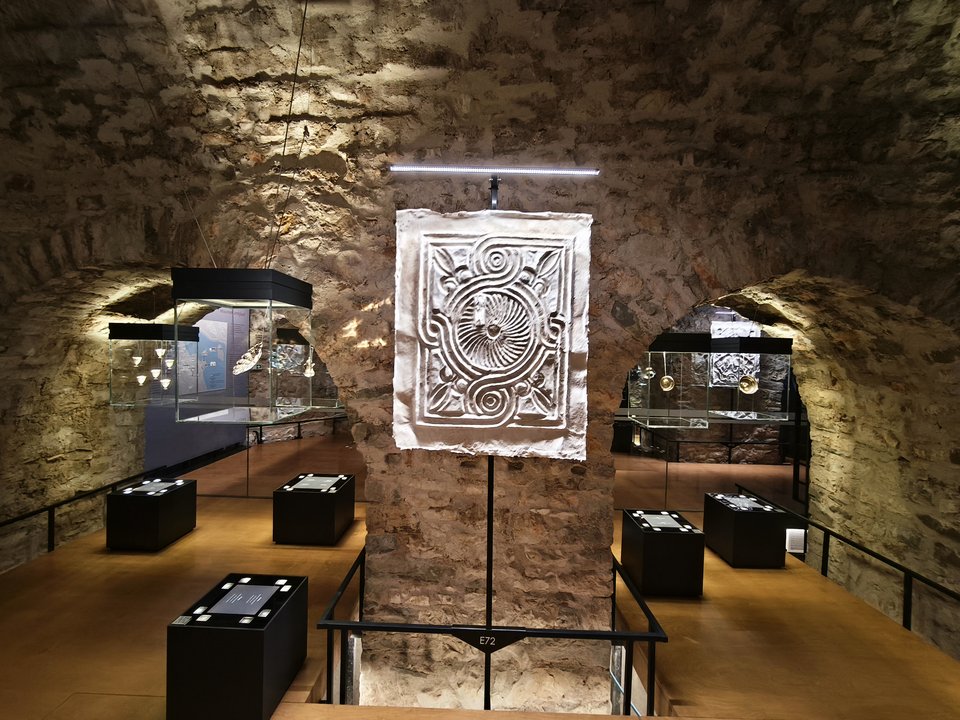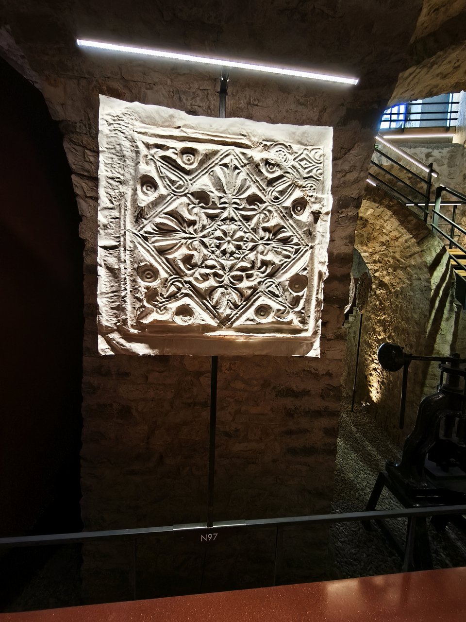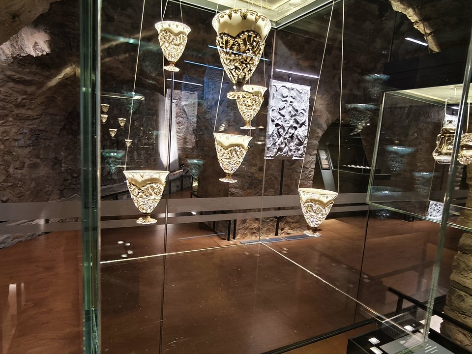 Και τότε, κοιτάζοντας μέσα από αυτά τα διάφανα κουτιά προς τα κάτω, στις πέτρινες καμάρες που στεγάζουν τα SPOLIA, συμβαίνει κάτι απολύτως μοναδικό: τα χάρτινα ανάγλυφα της Όκκα φαίνονται να ανήκουν στην ίδια οικογένεια με τα ασημένια έργα του μουσείου. Σαν η πέτρα να μιλά στο ασήμι. Σαν η επανάχρηση να γίνεται μορφή ζωής.