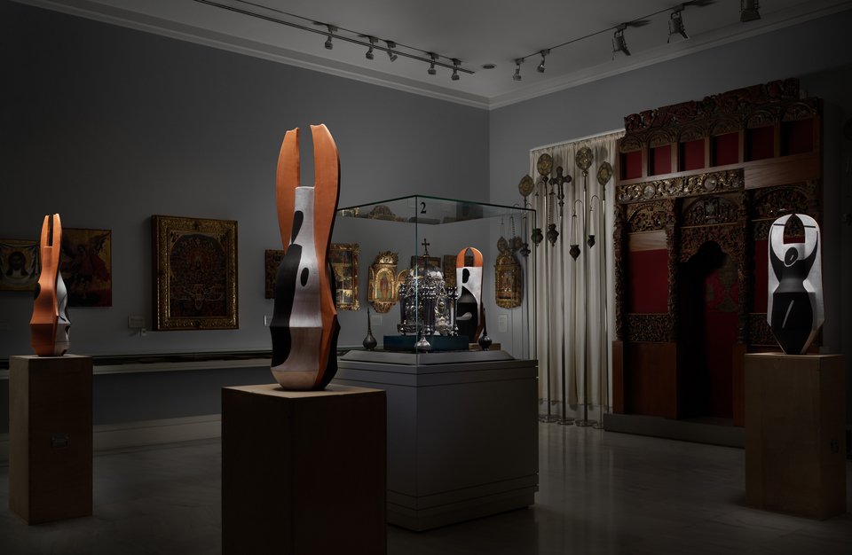 Η επιλογή των χώρων έγινε με κοινή συμφωνία των τριών. «Γρήγορα, ενστικτωδώς, χωρίς καμία διαφωνία. Δεν έγιναν πρώτα τα έργα και μετά τα τοποθετήσαμε. Το αντίθετο. Πρώτα φωτίστηκαν οι γωνίες που μας ενδιέφεραν και μετά έγιναν τα έργα. Το καθένα είναι φτιαγμένο για τον χώρο του» λέει η Νικομάχη. Κοιτώ τους Αρχαγγέλους στην αίθουσα 27, πλάι στα υπέροχα ξυλόγλυπτα τέμπλα που καλύπτουν τους τοίχους. Τέσσερις φιγούρες. «Είδα τα κενά στα τέμπλα και ήταν σαν να λείπουν εικόνες. Αμέσως σκέφτηκα τους αρχαγγέλους. Ετσι όπως είναι ζωγραφισμένα σε όλες τις πλευρές δεν ξέρεις ποιο είναι το μπρος και ποιο το πίσω. Η έννοια του βάθους και του κενού χώρου, σε κάνει να αναρωτιέσαι ακόμα και ποιο είναι το μέσα και ποιο το έξω». Είναι εκπληκτικό πως η παρουσία αυτών των έργων μέσα στη μουσειακή έκθεση σε κάνει να παρατηρείς και άλλα πράγματα. Σαν να βλέπεις το μουσείο καλύτερα.