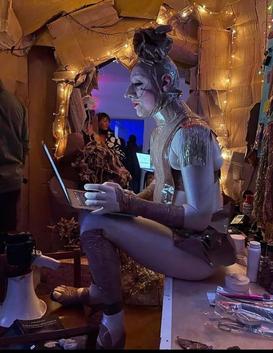 Μέσα στο διώροφο σπίτι -το Πολιτιστικό Κέντρο Λεωνίδας Κανελλόπουλος- διαφορετικά χρώματα neon σε κάθε δωμάτιο, αραδιασμένα όλα τα εργαλεία και τα υλικά που χρησιμοποιεί ο Ευριπίδης Λασκαρίδης για τις μεταμορφώσεις του, μύτες τεράστιες, στήθη κρεμασμένα, μάσκες, εκπληκτικά παπούτσια πλατφόρμες σε ασημένιο χρώμα, φράσεις που περνάνε από ειδικές οθόνες αποδομώντας με σαρδόνιο τρόπο αυτό που βλέπεις: Εleusis jamais -κατά το Κορωπί ζαμαί. Πολύ μοντέρνο instaελέησον. Ενας σκύλος αλυχτά, περφόρμερ φυσικά της Οsmosis, το σπίτι μυρίζει σέλινο που βράζει -ένα κατσαρολάκι πάνω σε μικρό ηλεκτρικό μάτι ατμίζει πλάι στην φωτεινή επιγραφή «uploading to the cloud».