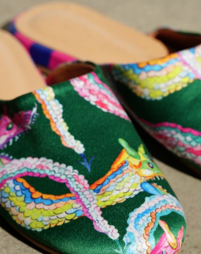 Tα slippers της σειράς (σατέν φλατ mules), ντυμένα με τέσσερα χαρακτηριστικά μοτίβα της RIANNA + NINA, μοιάζουν να έχουν ξεπηδήσει από τη συλλογή του μουσείου: σχέδια εμπνευσμένα από ιστορικά υφαντά και λαϊκές παραδόσεις, αποτυπωμένα πάνω σε σχέδια που ισορροπούν ανάμεσα στην αρχαϊκή απλότητα και στην αστική κομψότητα.