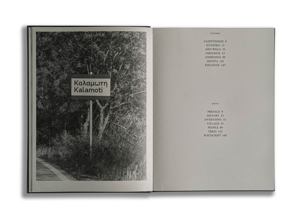 Τόσο το βιβλίο όσο και η έκθεση χωρίζονται σε τέσσερις ενότητες: Από ψηλά, Οικισμός, Άνθρωποι, Δέντρα. Από τις εναέριες κατόψεις που μοιάζουν με χειρόγραφα του 14ου αιώνα, μέχρι τα πορτρέτα των κατοίκων και τα μαστιχόδεντρα που στρίβουν το σώμα τους προς τον ήλιο, το βλέμμα του φωτογράφου συλλαμβάνει κάτι πιο ουσιαστικό από την ομορφιά: τη συνέχεια.