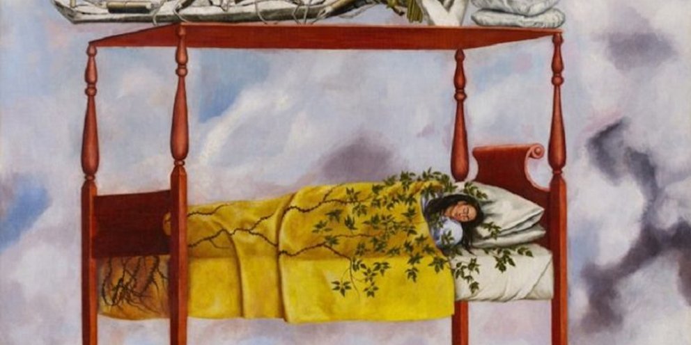 Στον πίνακα, η Φρίντα Κάλο εικονίζεται να κοιμάται σε ξύλινο κρεβάτι αποικιακού στιλ που μοιάζει να ίπταται στον ουρανό, ενώ στην οροφή του κρεβατιού της είναι ξαπλωμένος σκελετός, τυλιγμένος με μασούρια δυναμίτη, με ανθοδέσμη στο χέρι και κάτι σαν χαμόγελο.