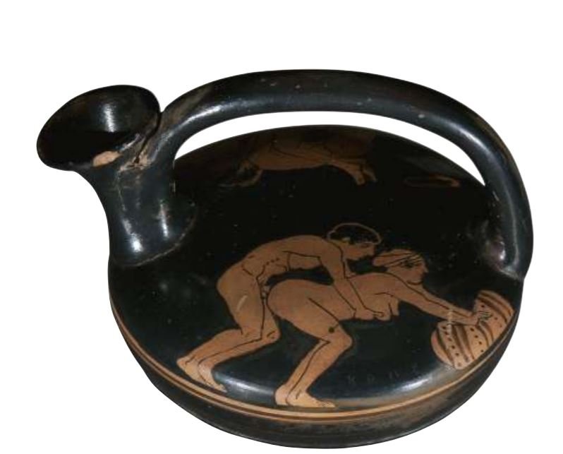Βέβαια δεν μπορούμε να προσπεράσουμε ένα ακόμα εύρημα, όπου η αθωότητα του φλερτ και ο αισθησιασμός του φιλιού, δίνουν τη θέση τους σε αποκαλυπτικές ερωτικές σκηνές. Πρόκειται για ερυθρόμορφο ασκό που εικονίζει νέο και νεαρή όμορφη (στην επιγραφή χαρακτηρίζεται «ΚΑΛΗ») δούλη σε ερωτικές περιπτύξεις. Το εύρημα είναι από το τελευταίο τέταρτο του 5ου αι π.Χ.  Η τόλμη, και οι λεπτομέρειες ξαφνιάζουν σήμερα τον θεατή και δημιουργούν ερωτήματα για το πρόσωπο στο οποίο ανήκε ο τάφος όπου βρέθηκε ο ασκός αυτός.