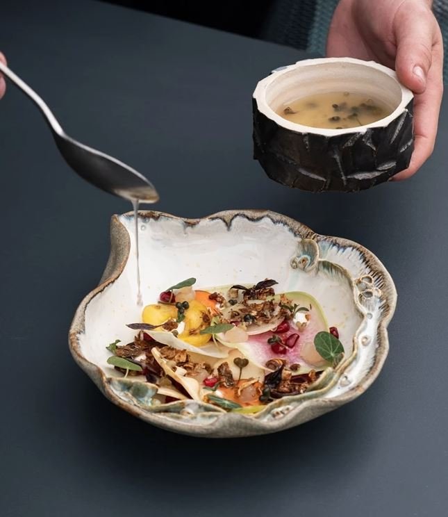 Μπροστά μας ένα υπέροχο πιάτο γλυπτό, φτιαγμένο με λουλούδια που έμειναν και στέγνωσαν μέσα στον πηλό. Μεταξύ των δημιουργών είναι η Μελίνα Ξενάκη, ο Ηλίας Χριστόπουλος, η Λυδία Λουκέλη, ενώ επίκειται συνεργασία και με το Mad Love. Οι υπέροχες πετσέτες, διάσπαρτες με πιτσιλιές χρωμάτων σε μια απαλή παλέτα, είναι δημιουργίες της Χριστιάνας Βαρδάκου -ετοιμάζει και κάποιες ζώνες που θα φοράει το προσωπικό του σέρβις. Οι πετσέτες βάφτηκαν με φλούδες από αβοκάντο, ρόδι και κρεμμύδια.